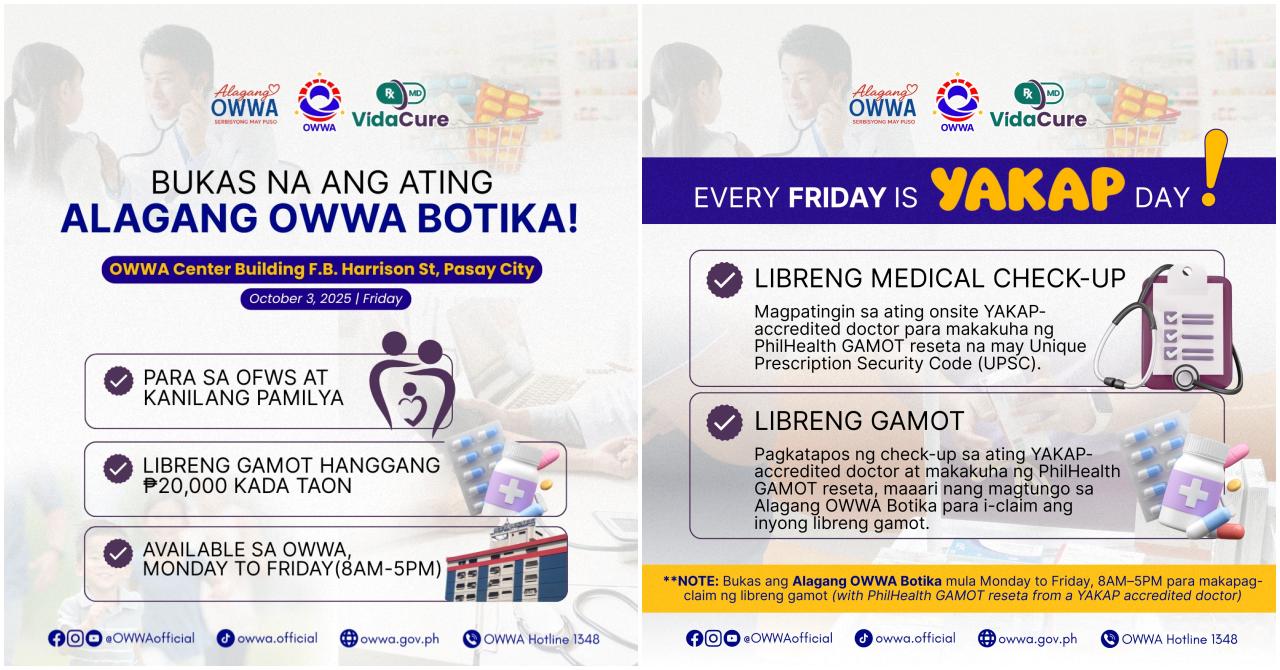 Based on a report by the Philippine News Agency (PNA), “Alagang OWWA Botika” was launched last Friday, October 3, 2025, at the agency’s head office in Pasay City. OWWA Administrator Patricia Yvonne Caunan stated that the program aims to benefit OFWs and their families, even after they have finished working abroad.