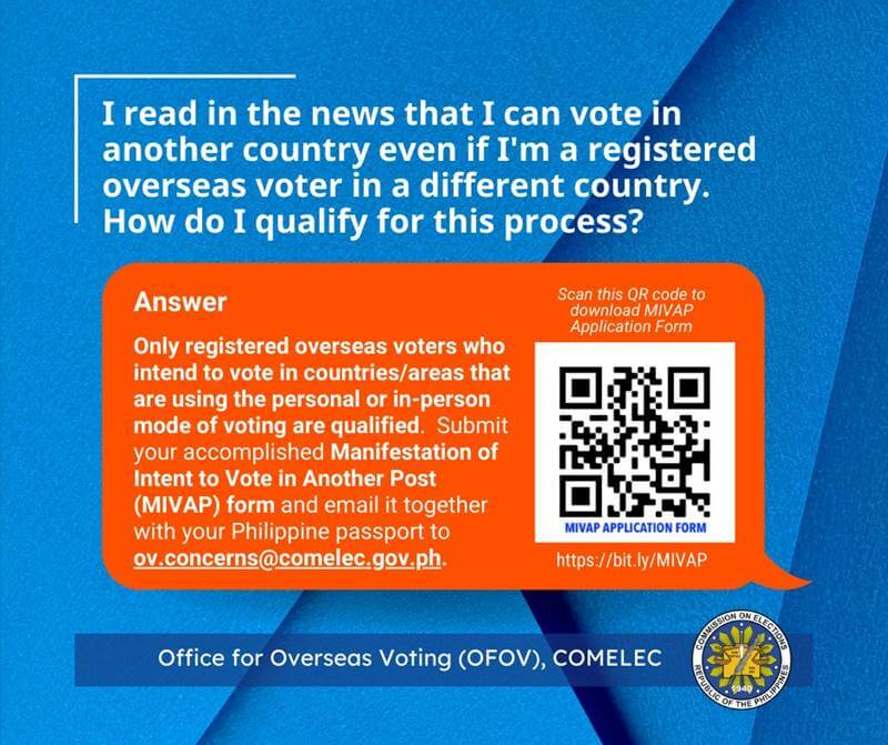 Only registered overseas voters who intend to vote in countries/areas that are using the personal or in-person mode of voting are qualified. Submit your accomplished Manifestation of Intent to Vote in Another Post (MIVAP) form and email it together with your Philippine passport to ov.concerns@comelec.gov.ph.