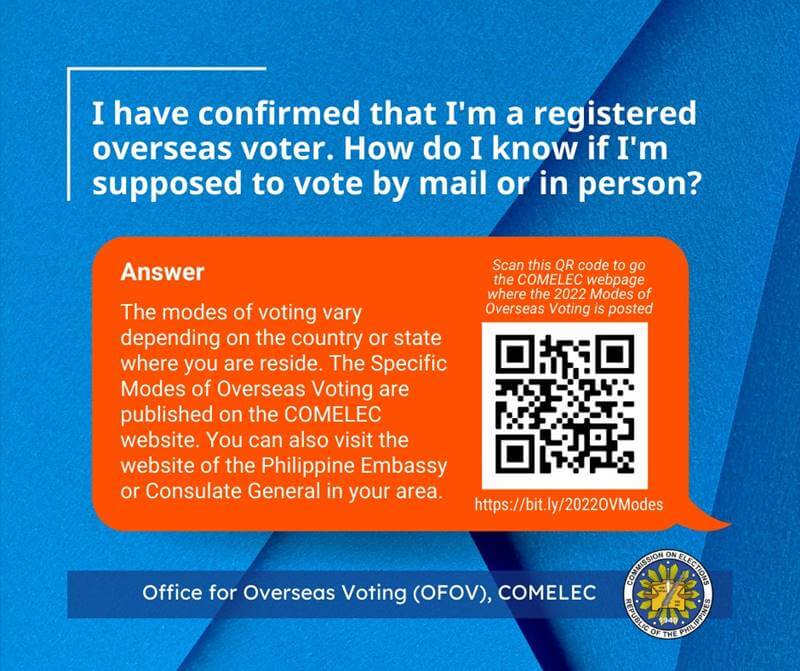 The modes of voting may vary depending on the country or state where you reside. The Specific Modes of Overseas Voting are published on the COMELEC website. You can also visit the website of the Philippine Embassy or Consulate General in your area.
