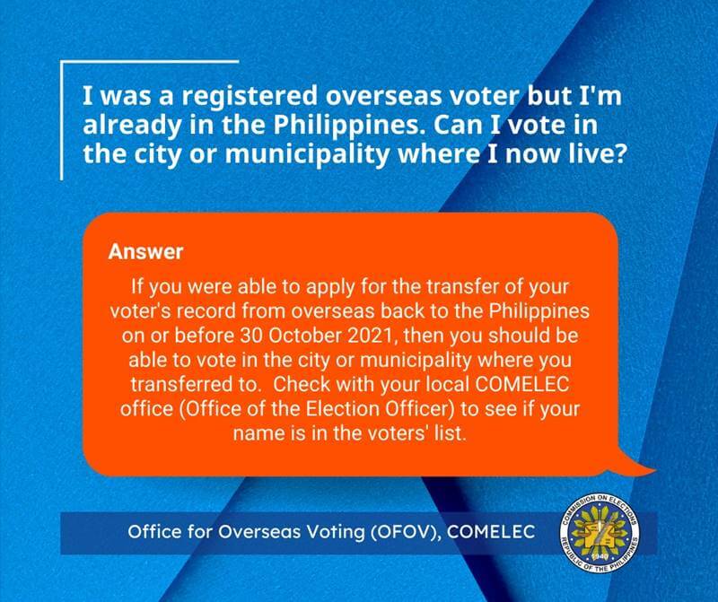 If you were able to apply for the transfer of your voter’s record from overseas back to the Philippines on or before 30 October 2021, then you should be able to vote in the city or municipality where you transferred to. Check with your local COMELEC office (Office of the Election Officer) to see if your name is on the voter’s list.