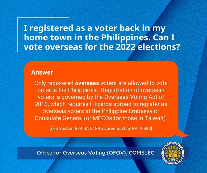 17. I registered as a voter back in my home town in the Philippines. Can I vote overseas for the 2022 elections?