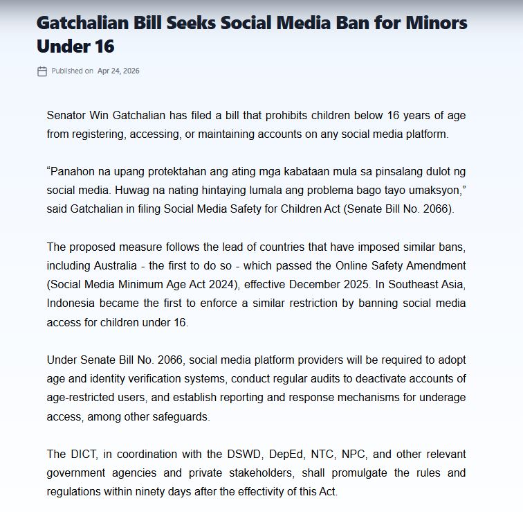 Senator Gatchalian initiative underscores the growing concern over the impact of social media on young users and aims to create a safer digital environment for Filipino children.