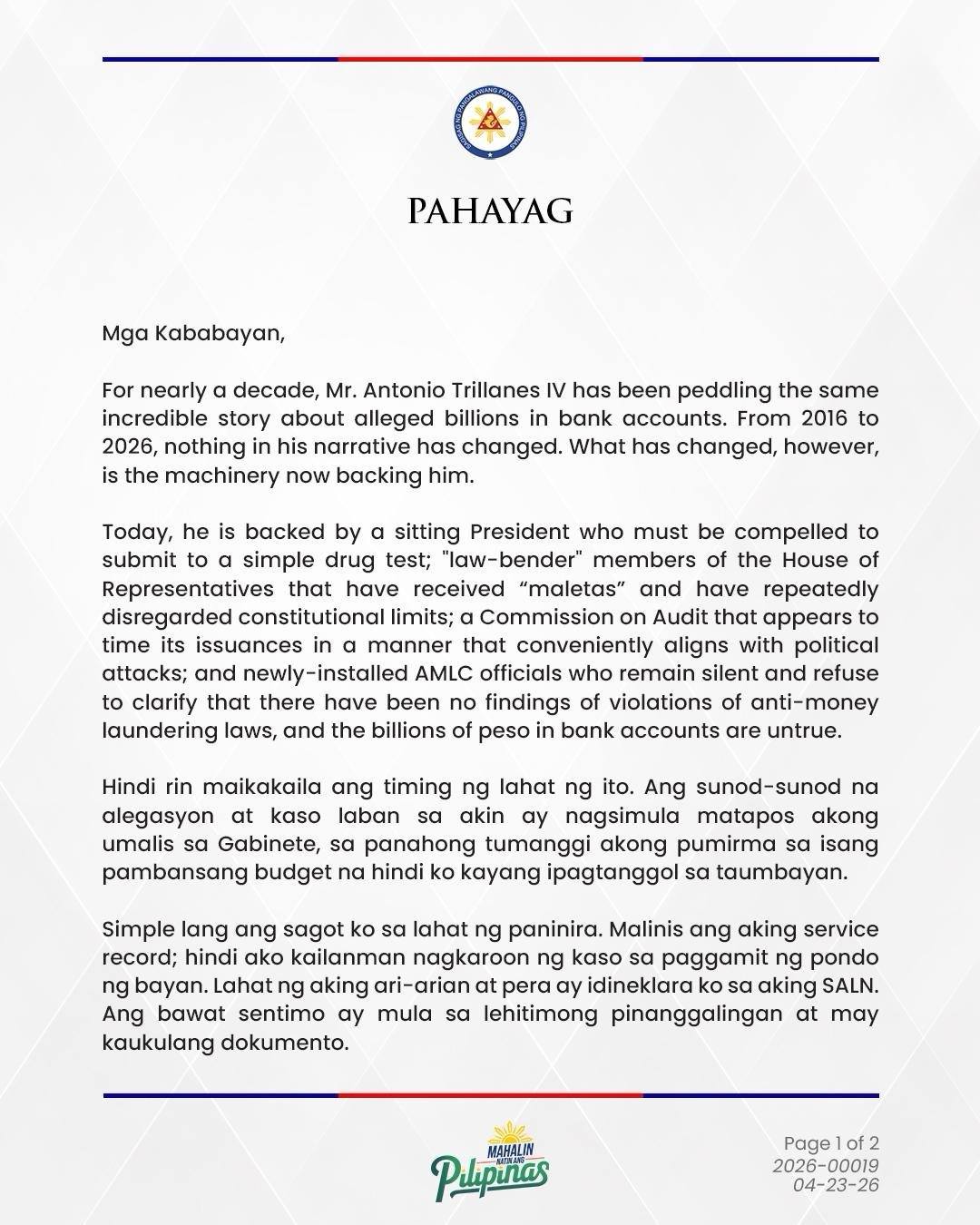 April 23, 2026 – Vice President Sara Z. Duterte has issued a strong statement addressing allegations of corruption and political attacks against her, emphasizing her clean track record and calling out the alleged misuse of government institutions for political gain.